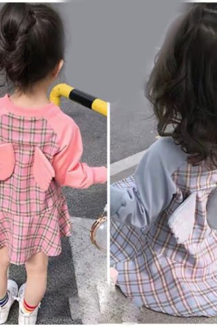 Girl’s Full Sleeves Round Neck Frock With Wings Applique Checked Print