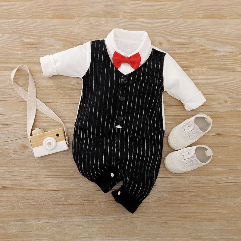 Full Sleeves Checks Party Wear Rompers with Attached Waistcoat & Bow