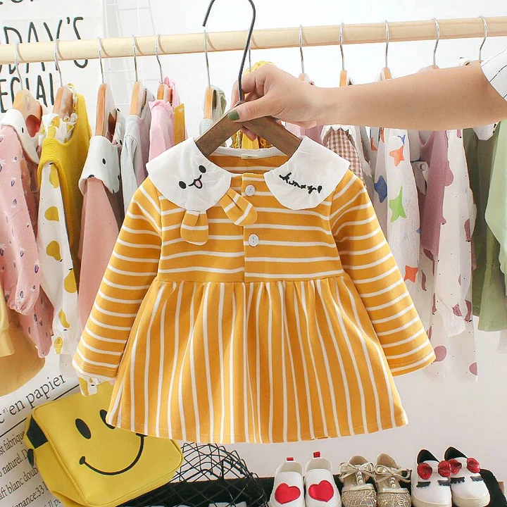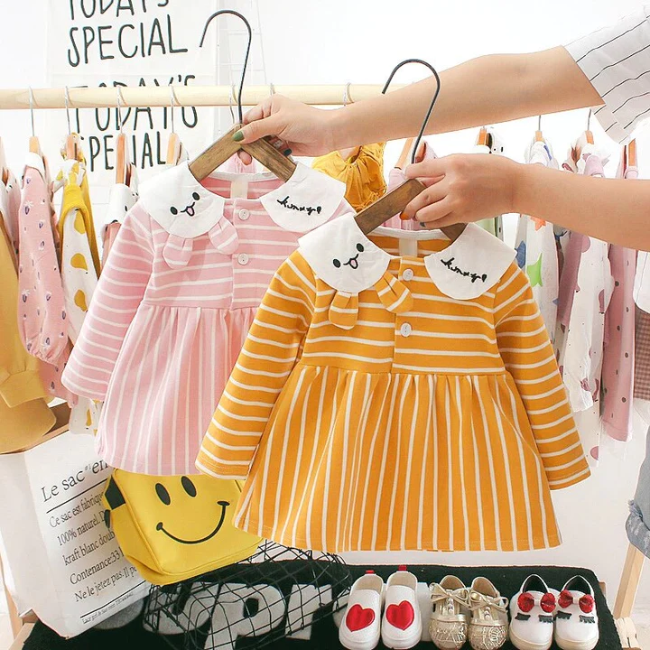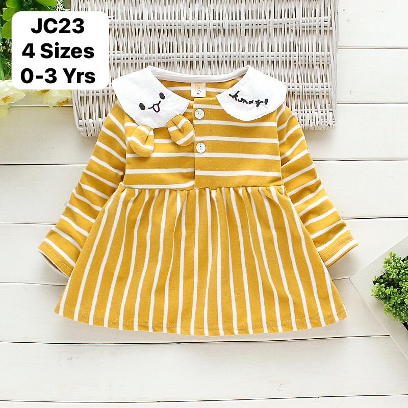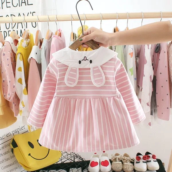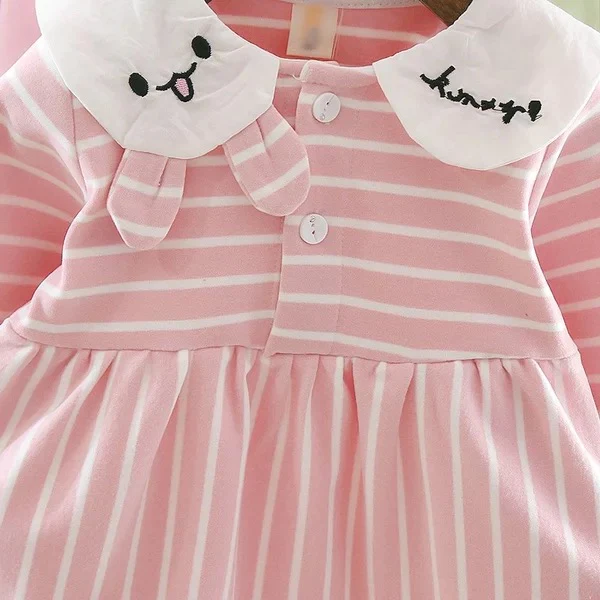 Girl’s Korean Style Long Sleeve Bunny Collar Neck White Striped Frock