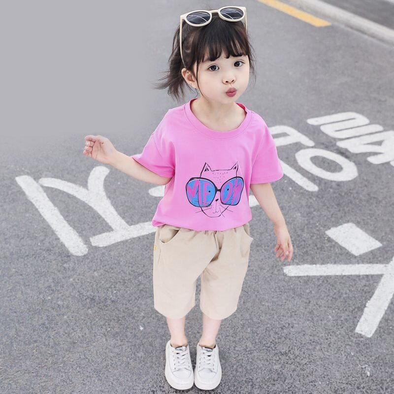 Girl’s Round Neck Pink T-Shirt And Light Brown Shorts Set Cool Cat Print