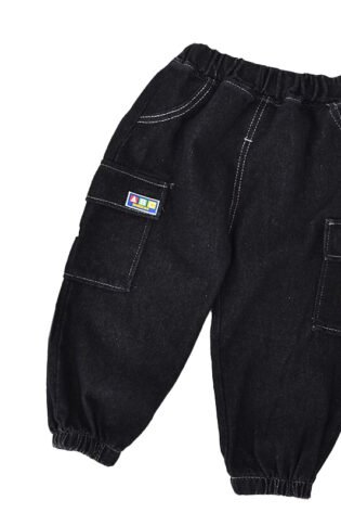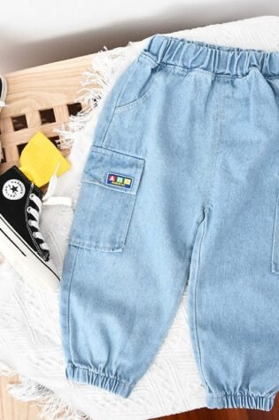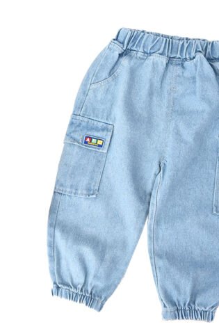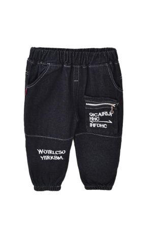 Boy’s / Girl’s Cotton Elastane Full Length Washed Denim Jeans With Text Print And Lion Patch Work