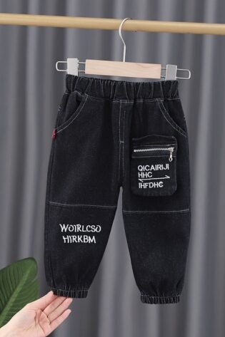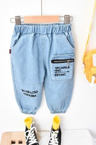 Boy’s / Girl’s Cotton Elastane Full Length Washed Denim Jeans With Text Print