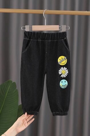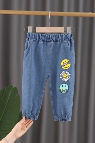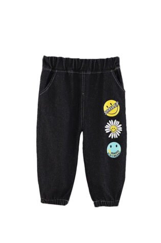 Boy’s / Girl’s Cotton Elastane Full Length Washed Denim Jeans With Smiley Print